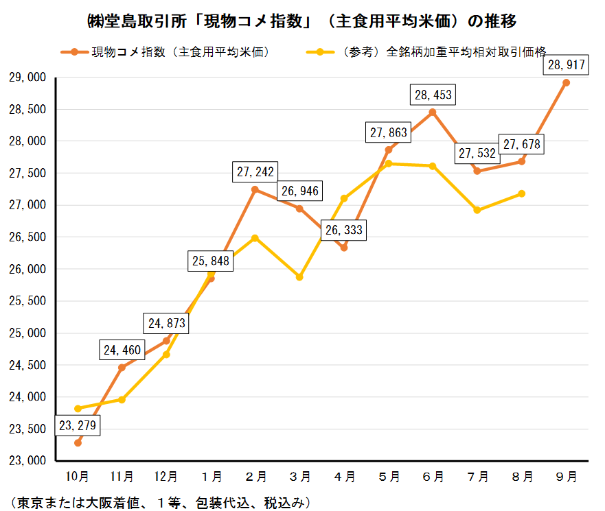 ㈱堂島取引所(大阪府大阪市西区阿波座)は9月30日、9月の令和6年産「現物コメ指数」を、前月比+1,239円の「28,917円」と発表した。続伸にあたり、過去最高値を更新した。