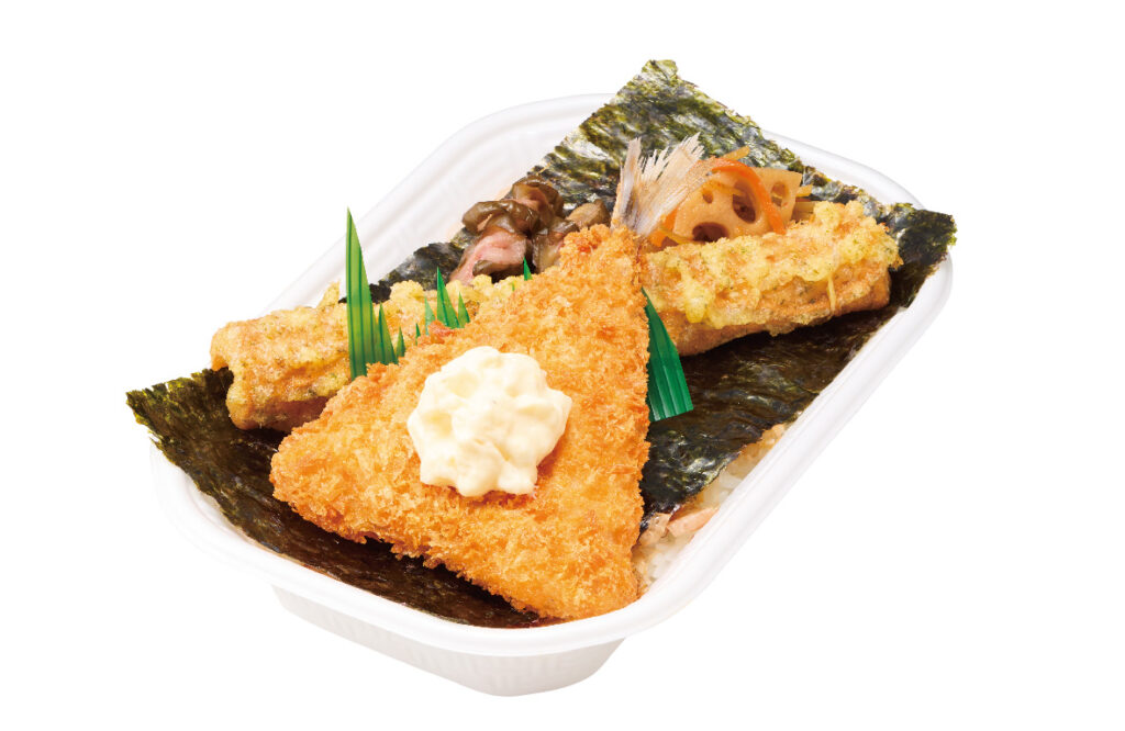 創業時からの定番商品「のり弁当」の白身フライに代わりアジフライを乗せた新たなバリエーションにあたる。「2種のパン粉をミックスしたサクサク衣のアジフライに、『チキン南蛮弁当』でお馴染みの玉子をたっぷり使用したタルタルソースがマッチし、ごはんが進むお弁当」との触れ込み。