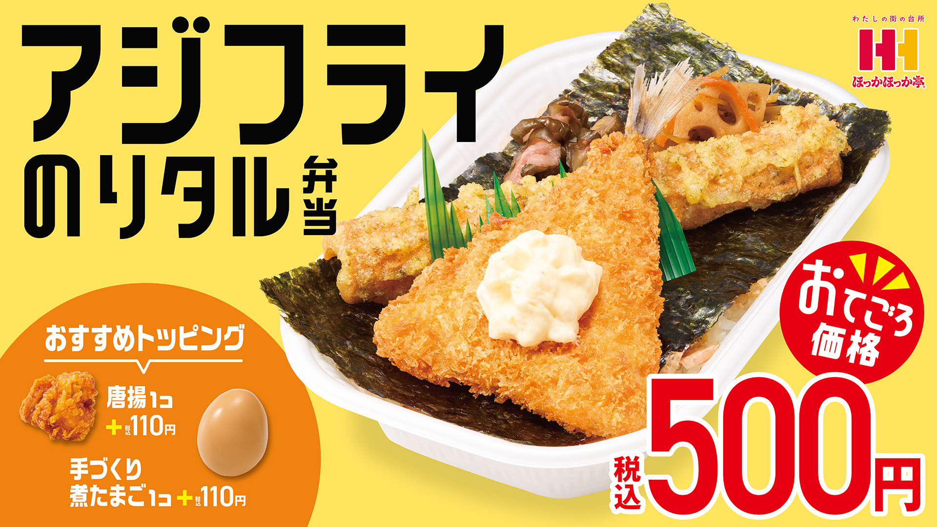 持ち帰り弁当「ほっかほっか亭」などを展開する㈱ハークスレイ(大阪府大阪市)は10月1日から、新商品「アジフライのりタル弁当」(税込500円)を発売する。