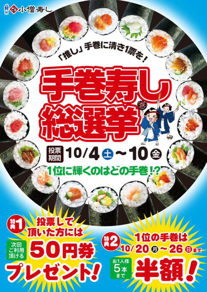 ㈱小僧寿し(東京都中央区)が運営する持ち帰り寿司店「小僧寿し」は10月4日から、「手巻寿し総選挙〝推し手巻〟グランプリ」を開催する。10月10日までの期間中に投票した人には、もれなく「50円券」をプレゼント。1位に輝いた手巻きは、10月10~26日の間、半額になる。
