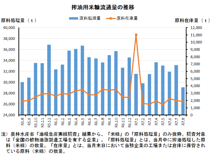 一方、8月の搾油用原料のうち「米」の在庫数量は1,860tで、前月比▲6.9%と続落し、前年同月比▲47.3%と7か月連続落した。