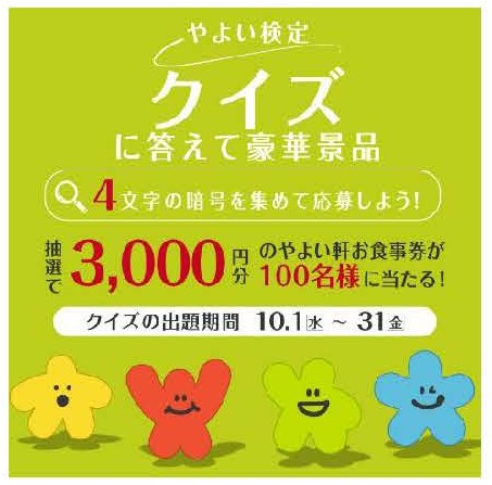 イベント やよい軒プレナス 3,000円分お食事券が当たる「やよい検定」 イベント X Facebook LINE コピー 2025.10.02 ㈱プレナス(東京都中央区)が展開する定食レストラン「やよい軒」は10月1日から、クイズに答えて豪華景品が当たる「やよい検定」を開始した。10月31日までの期間中、公式アプリ内「やよい検定」特設ページで4つのクイズに回答し、集めた〝暗号〟を専用応募フォームに入力して応募する。全問正解者のなかから抽選で100人に、やよい軒3,000円分お食事券が当たる。