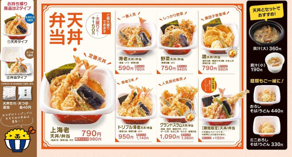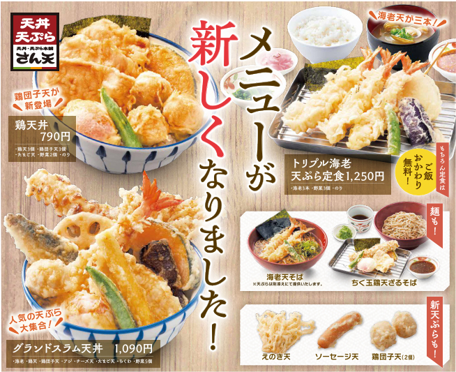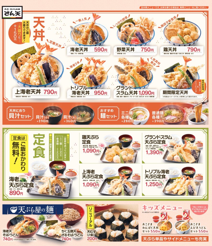 新商品 さん天サトフードサービスSRSグループ 天丼・天ぷら本舗 さん天がグランドメニュー刷新へ 新商品 X Facebook LINE コピー 2025.10.03 SRSグループのサトフードサービス㈱(大阪府大阪市)が中京から関西地方に店舗展開する「天丼・天ぷら本舗 さん天」は10月6日から、グランドメニューを刷新する。刷新後グランドメニューの「おすすめ商品」は以下の通り(価格は税込)。 鶏天丼790円 グランドスラム天丼1,090円 トリプル海老天ぷら定食1,250円