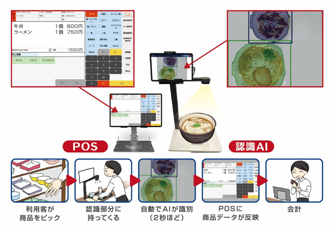 商品をAIが約2秒で認識すると、POSに商品データを反映、会計に繋ぐ仕組み。飲食店舗などに設置することで、レジ業務の効率化に役立つ。商品アイテムが多い飲食店だと、不慣れなスタッフが商品キー探しに手間どり、レジ前に行列が発生しがち。これを避けるため熟練スタッフを充てれば、人時生産性の低下を招きかねない。新商品は、こうした課題を解決するための仕組みで、スタッフの習熟度によらず迅速な会計を実現できる。