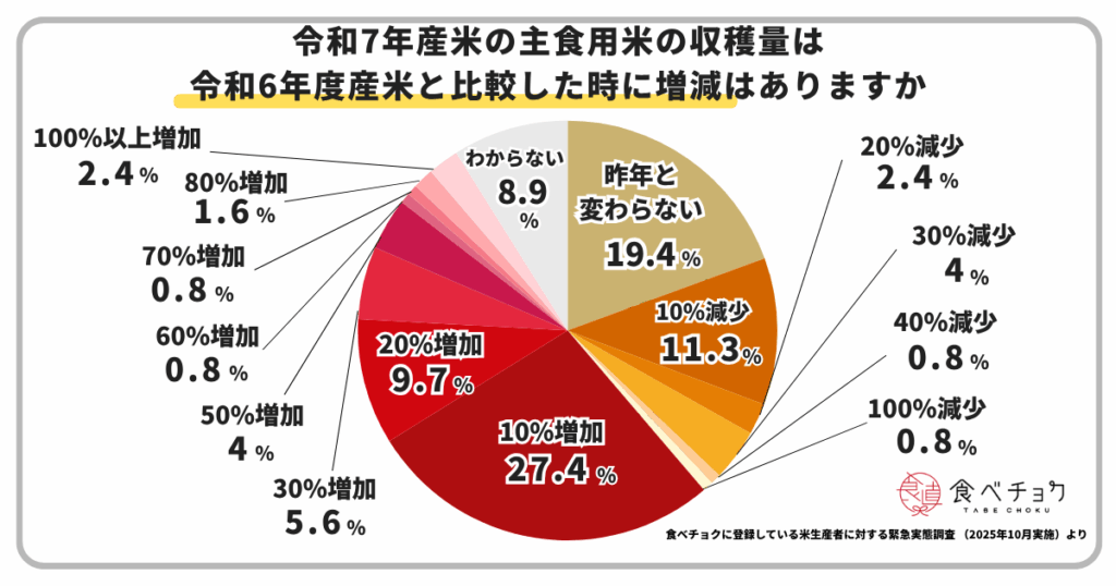 調査統計 食べチョク 食べチョク調査、今後の米増産方針45.2% 調査統計 X Facebook LINE コピー 2025.10.20 産直通販サイト「食べチョク」を運営する㈱ビビッドガーデン(東京都港区)は10月17日、登録生産者を対象とした「米の実態調査」結果を発表した。それによると、前年産に比べ令和7年産を「増産している」と回答した米農家は52%にのぼり、「今後も増産していく方針」と回答した割合は45.2%となっている。総体に前向きな姿勢で、同日農林水産省が公表した調査結果とは大きくトーンが異なる。