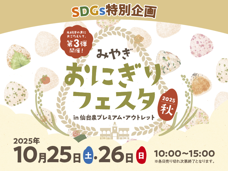 宮城県仙台市の「仙台泉プレミアム・アウトレット」で10月25日、「みやぎ おにぎりフェスタ2025秋」が開幕する。10月26日まで。昨年6月から開始、3回目の今回は、県内おにぎり店を中心に延べ26店舗が集結する。