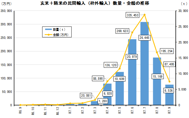 財務省が10月30日に公表した輸入通関実績によると、9月の外国産米輸入量が再び激減したものの、依然として前年同月の160倍前後を維持しており、令和7年(2025)累計が9万tに迫る勢いであることが明らかになった。9月の外国産米(枠外)輸入量は、6,536t(前月比▲56.9%、前年同月比+15841.5%)、8億7,495万2千円(前月比▲55.2%、前年同月比+16489.9%)。