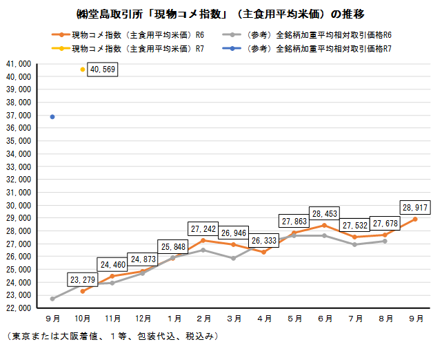 堂島・現物コメ指数、令和7年産10月は最高値更新40,569円