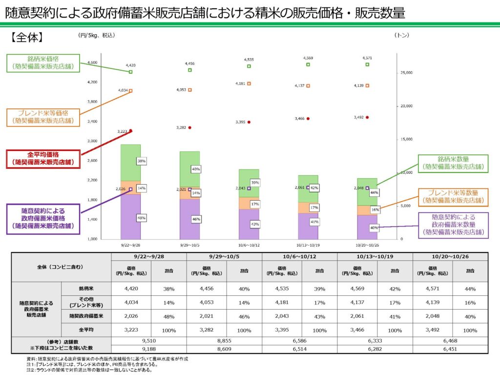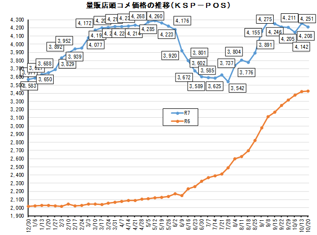 農林水産省は10月31日、米穀末端価格の3つのデータを更新、公表した。それによると10月20日(月)~10月26日(日)のスーパーなど量販店頭価格(5㎏あたり精米)は、KSP-POS▲43円の4,208円、日経POS+97円の3,808円、小売店パネル+32円の4,279円。上げ下げ混在ながら結果的に前週と同様、日経POSのみ3,000円台を維持している。〝高い〟令和7年産米が主体となるにつれ、3指標そろって4,000円台到達は既定路線と言える。値段が上がれば買い控える。KSP-POSによると、5週連続で販売数量が減少傾向にある。