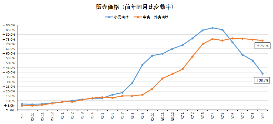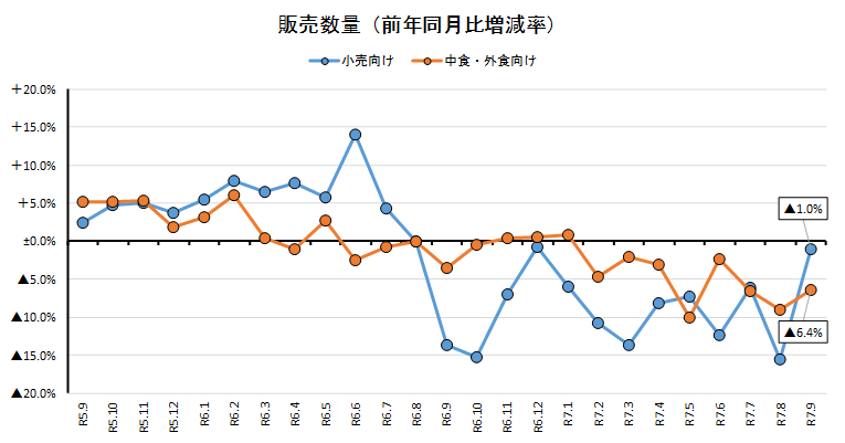 相場 米価農林水産省 9月の小売向け米価、前年比プラス幅5か月連続で圧縮 相場 X Facebook LINE コピー 2025.10.31 農林水産省の公表によると、今年9月の小売向け米販売価格の前年比プラス幅が5か月連続で縮まっていたことが分かった。中食・外食向けの前年比プラス幅圧縮は4か月連続。ともに随意契約による政府備蓄米の影響で、この時点では「高い」新米が大量には到達していないものとみられる。販売数量は、小売向け、中食・外食向けともに前年比マイナスの〝水面下〟が連続しているものの、マイナス幅そのものは縮小した。10月31日の公表「米穀販売事業者における販売数量及び販売価格の動向(令和7年9月)」によるもの。