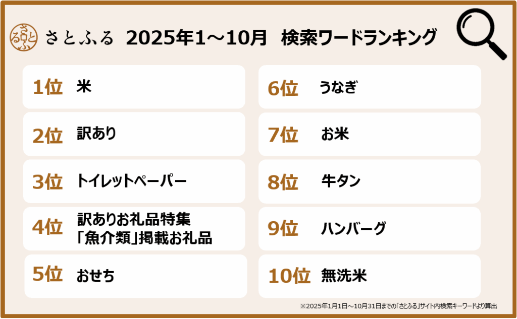 ふるさと納税ポータルサイト「さとふる」を運営する㈱さとふる(東京都中央区)は11月5日、今年10月までのふるさと納税返礼品トレンドを発表した。それによると、検索キーワードランキングのトップ20に、1位「米」、7位「お米」、10位「無洗米」など、米関連ワードが5件ランクインした。6月までの上半期は5件がトップ10にランクインしていたことからすると、「寄附者の米不足への危機感はやや落ち着いた」と言えるものの、「引き続き『米』に対して高い関心が寄せられていることが窺える」と分析している。