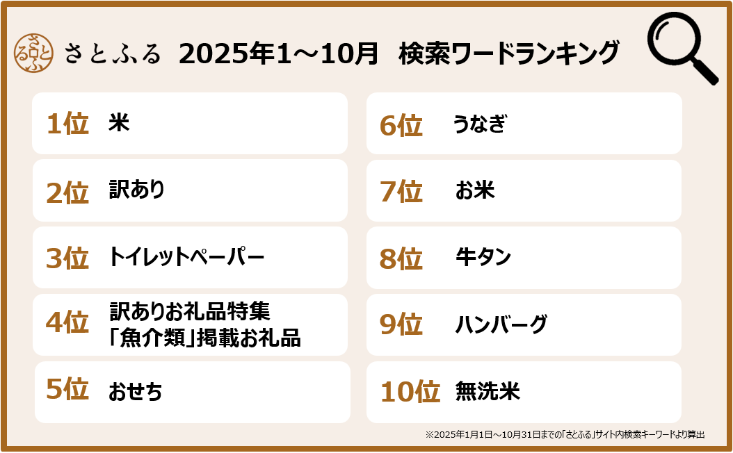 ふるさと納税ポータルサイト「さとふる」を運営する㈱さとふる(東京都中央区)は11月5日、今年10月までのふるさと納税返礼品トレンドを発表した。それによると、検索キーワードランキングのトップ20に、1位「米」、7位「お米」、10位「無洗米」など、米関連ワードが5件ランクインした。6月までの上半期は5件がトップ10にランクインしていたことからすると、「寄附者の米不足への危機感はやや落ち着いた」と言えるものの、「引き続き『米』に対して高い関心が寄せられていることが窺える」と分析している。