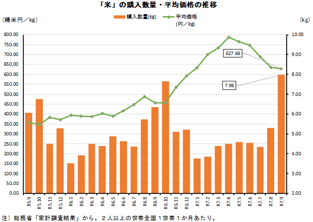 総務省は11月7日、9月の家計調査結果を公表した。それによると「米」(2人以上の世帯全国1世帯1か月あたり)の平均価格が、前月比▲8.27円の㎏627.66円となった。5か月連続の下落にあたり、今年1月(㎏633.29円)を下回る水準となった。加えて9月の購入数量が大きく増加し、昨年10月以来の高水準に達した。これにより1世帯あたりの支出金額総額を押し上げ、前月比+48.5%、前年同月比+72.4%の5,011円となった。米の1世帯あたり支出金額が5,000円台に達するのは、少なくとも令和2年()以来の過去6年間で一度もない。これまでの最高額は今年4月の3,546円だったから、4,000円台すら飛び越えて最高額を更新したことになる。