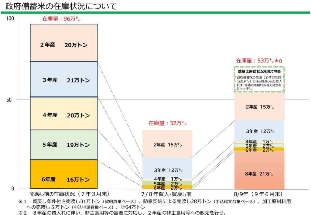 報告によると、現在の政府備蓄米在庫は32万t。ただしこれには、5年間の保管期限が切れる令和2年産米15万tを含んでいる。ここに、まず令和7年産米では中止していた従来の政府米備蓄米買入入札によって、令和8年産米を積み上げる。すると来年6月末在庫は、期限切れの令和2年産米を除き、53万tになる勘定。