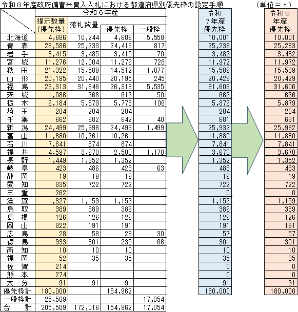 令和8年産政府備蓄米の買入入札は従来通りの方式に戻し、年明け1月以降、6月までに最大7回実施して21万tを買い入れる。提示の際の都道府県別優先枠は、本来実施するはずだった令和7年産米の優先枠をそのままスライドして18万t設定する。