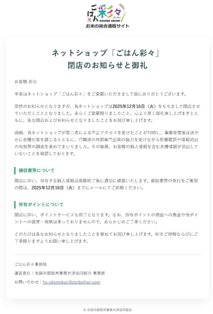信用情報 全米販 全米販がネット通販サイト「ごはん彩々」閉店 信用情報 X Facebook LINE コピー 2025.11.17 米穀販売業者(卸売業者)の全国団体である全米販(全国米穀販売事業共済協同組合)は11月17日、ネット通販サイト「ごはん彩々」の閉店を明らかにした。12月16日をもって閉店する。すでに販売メニューは閉鎖済み。閉店理由は明言していないが、「第三者による不正アクセスを受けた」ことに言及している。