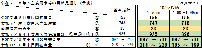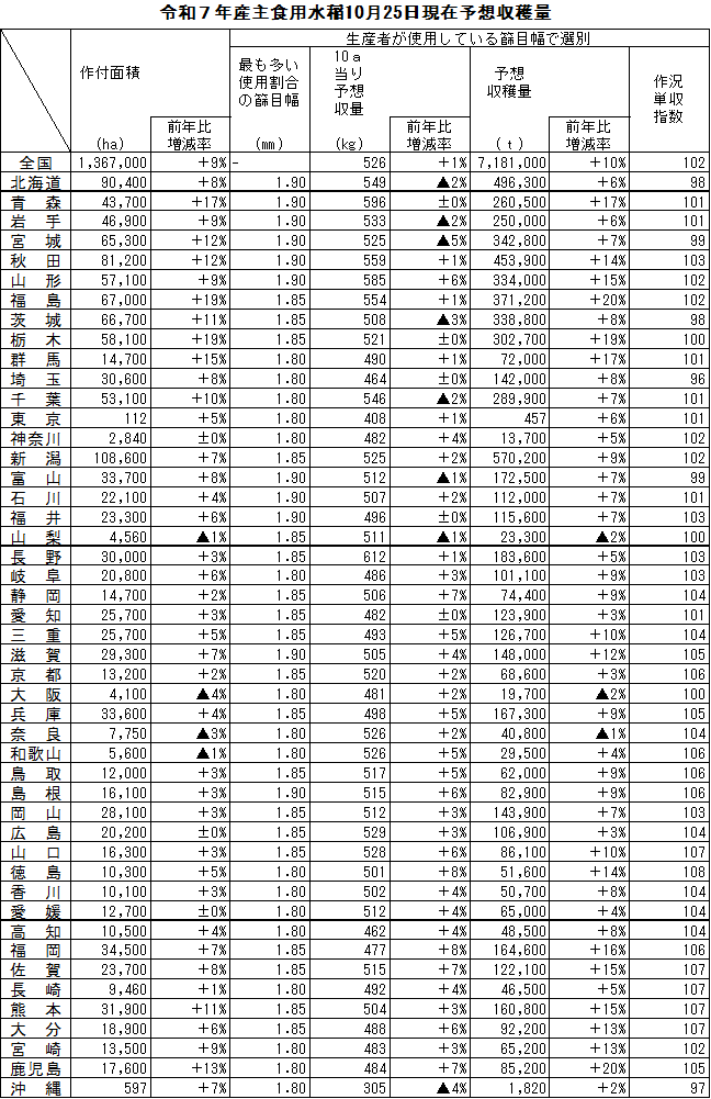 農林水産省は11月18日、令和7年産水稲の10月25日現在予想収穫量を公表した。それによると主食用米生産量は、従来通り1.70㎜篩目幅だと前年比+67万6千t(+15.5%)の746万8千tで、9月25日現在から9千t下方修正した。生産者が実際に使う1.80~1.90㎜篩目幅だと前年比+66万2千t(+9.7%)の718万1千tで、こちらは2万8千tの上方修正にあたる。