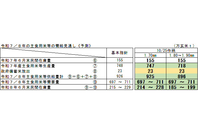 農林水産省は11月18日、令和7年産水稲の10月25日現在予想収穫量を公表した。それによると主食用米生産量は、従来通り1.70㎜篩目幅だと前年比+67万6千t(+15.5%)の746万8千tで、9月25日現在から9千t下方修正した。生産者が実際に使う1.80~1.90㎜篩目幅だと前年比+66万2千t(+9.7%)の718万1千tで、こちらは2万8千tの上方修正にあたる。