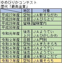 「ゆめぴりかコンテスト」は、平成27年産から開催。事前に7地区の地区予選を勝ち抜いた産地(地区金賞)が最終審査会に駒を進め、最終審査会で「最高金賞」が決まる。