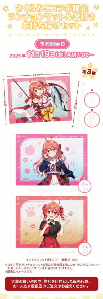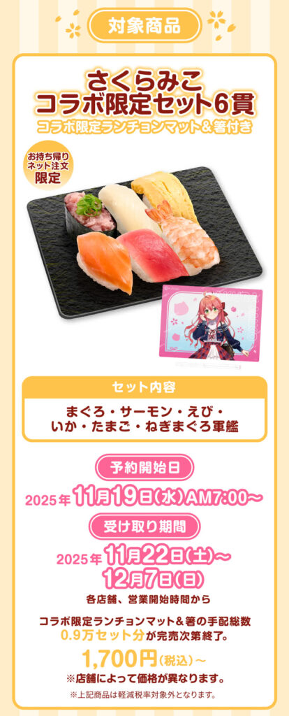 回転寿司チェーン「スシロー」を展開する㈱あきんどスシロー(大阪府吹田市)は11月21日、バーチャルアイドル「さくらみこ」とのコラボキャンペーン「にゃっはろ~スシろ~!」のうち、一部商品の完売を発表した。完売したのは持ち帰り・ネット注文限定の「コラボ限定ランチョンマット&箸付き お持ち帰りセット」で、0.9万セットを用意していたが、11月19日のキャンペーン開始から2日間で売り切れたことになる。