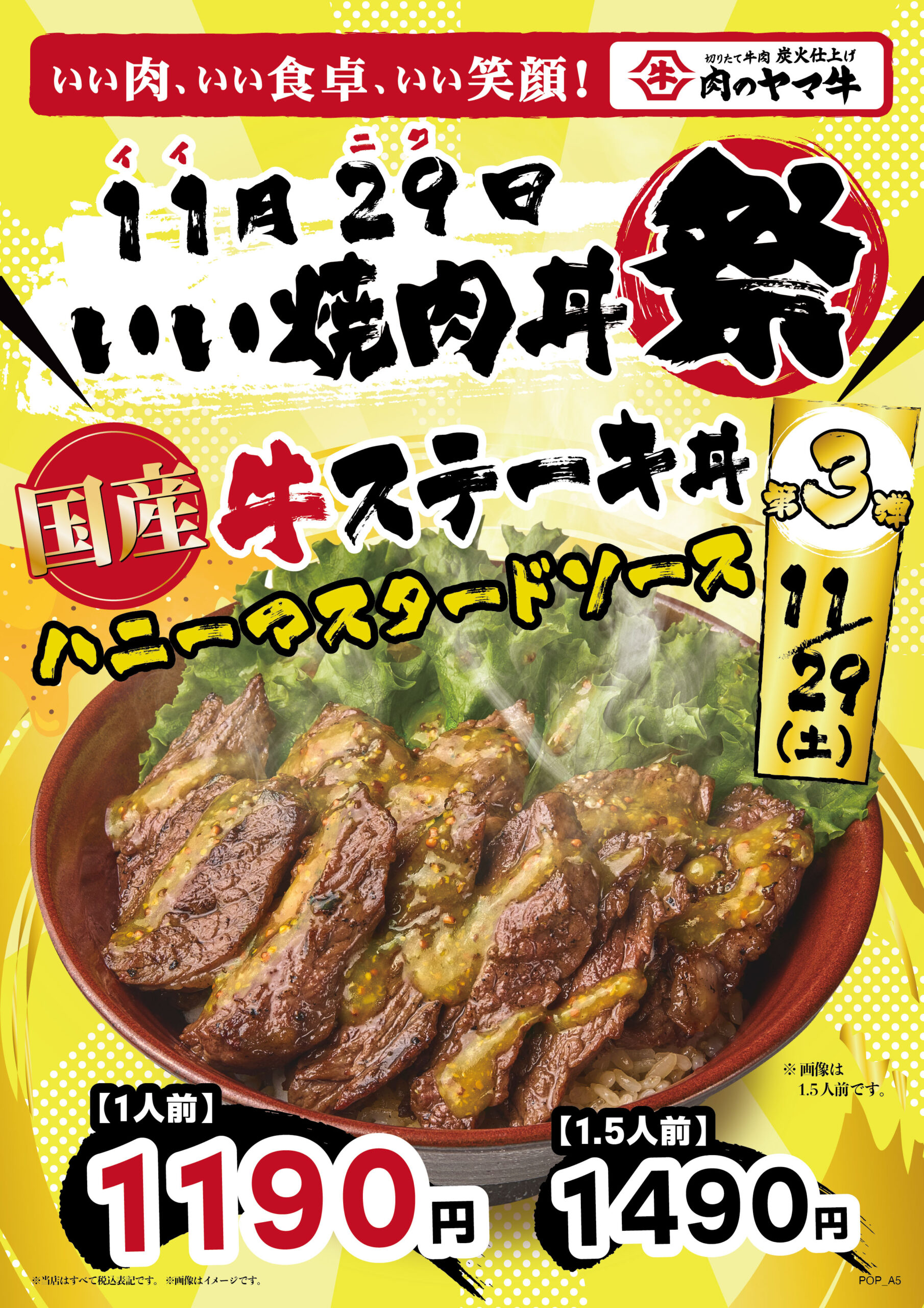 イベント トリドール 「肉のヤマ牛」11月29日のみ限定、特別価格で「国産牛ステーキ丼」 イベント X Facebook LINE コピー 2025.11.26 丸亀製麺を展開する㈱トリドールホールディングス(東京都渋谷区)グループの㈱肉のヤマ牛(東京都渋谷区)が展開する外食チェーン「肉のヤマ牛」は、11月29日の1日限定で、「国産牛ステーキ丼」を販売する。「11(いい)やき29(にく)丼祭り」第3弾の位置として、1人前1,190円、1.5人前1,490円(写真)の特別価格で提供する。