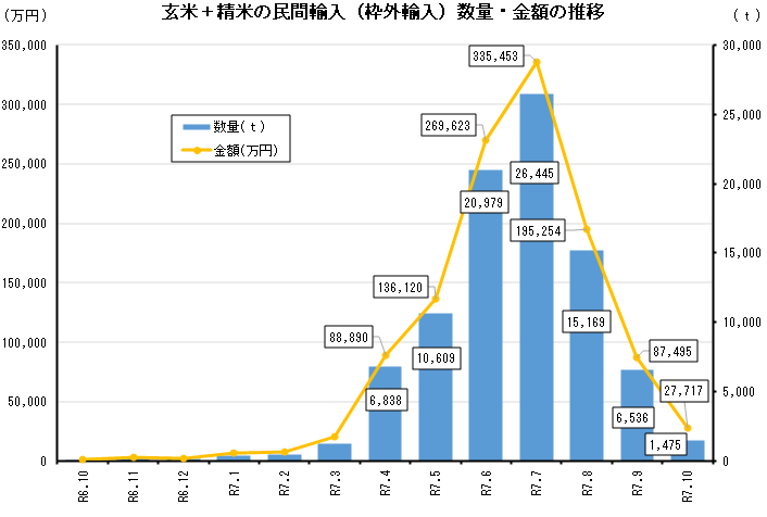 財務省が11月27日に公表した輸入通関実績によると、10月の外国産米輸入量がまたも激減したものの、令和7年(2025)累計が9万tを超えたことが明らかになった。10月の外国産米(枠外)輸入量は、1,475t(前月比▲77.4%、前年同月比+1486.0%)、2億7,717万2千円(前月比▲68.3%、前年同月比+1645.4%)。