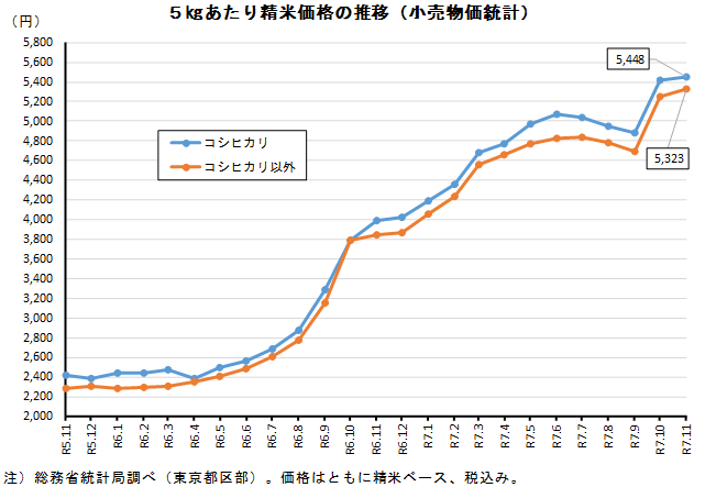 相場 小売物価統計 11月の23区5kgコシ、非コシとも2か月連続で過去最高値更新 相場 X Facebook LINE コピー 2025.11.28 総務省は11月28日、11月の小売物価統計(東京都区部のみ)を発表した。それによると、2か月連続で過去最高値を更新している。「コシヒカリ」前月比+27円の5,448円、「コシヒカリ以外」+75円の5,323円は、ともに小幅続伸にあたる。「高い」新米が主体になってきたためか。前年同月比増減率は、コシ+36.7%、非コシ+38.5%と、相変わらず高値なものの、引き続き上げ幅は鈍る傾向にある。