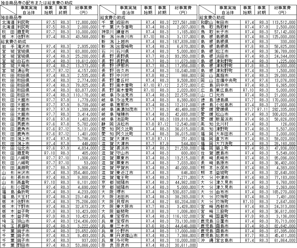 ただ一口に米購入に対する支援といっても手法は様々で、「おこめ券」の配布はメジャーな手法とは言い難い。最も多かったのは「給食費の助成」による支援で、延べ135自治体54億6,750万2千円と圧倒的だ。次いで多いのが、だいぶ水をあけられているものの現物(米)の配布で、29自治体4億3,033万1千円。その次に、ようやく「おこめ券」の配布がくる。最後が、既製の「おこめ券」ではなく独自の「お米クーポン」を配布するパターンで、12自治体131億7,384万9千円となっている。