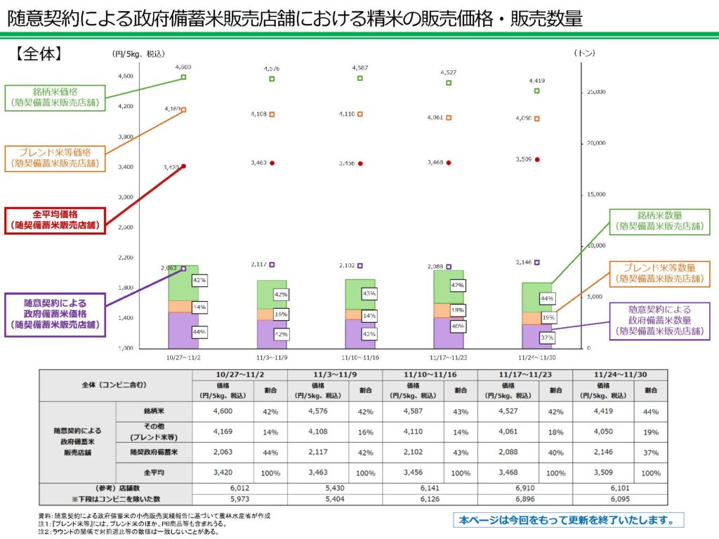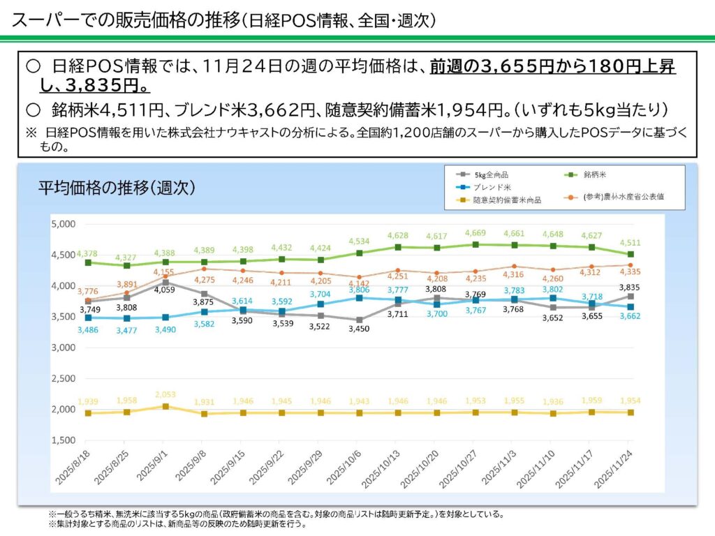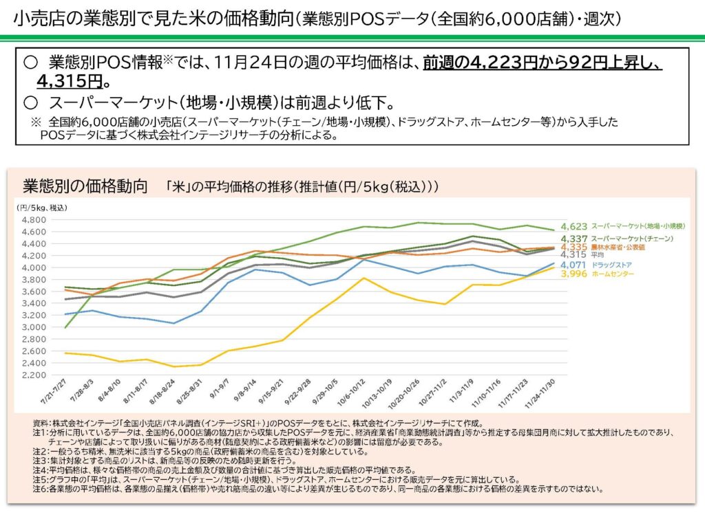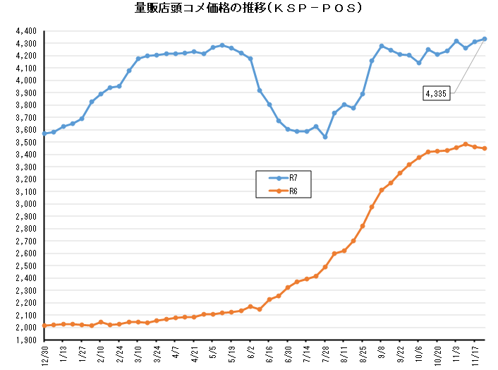 農林水産省は12月5日、米穀末端価格の3つのデータを更新、公表した。それによると11月24日(月)~11月31日(日)のスーパーなど量販店頭価格(5㎏あたり精米)は、KSP-POS+23円の4,335円、日経POS+180円の3,835円、小売店パネル+92円の4,315円。3指標そろって全面高ながら結果的に前週と同様、日経POSのみ3,000円台を維持した。値段が高ければ買い控える。KSP-POSによると、販売数量は再び減少に転じている。
