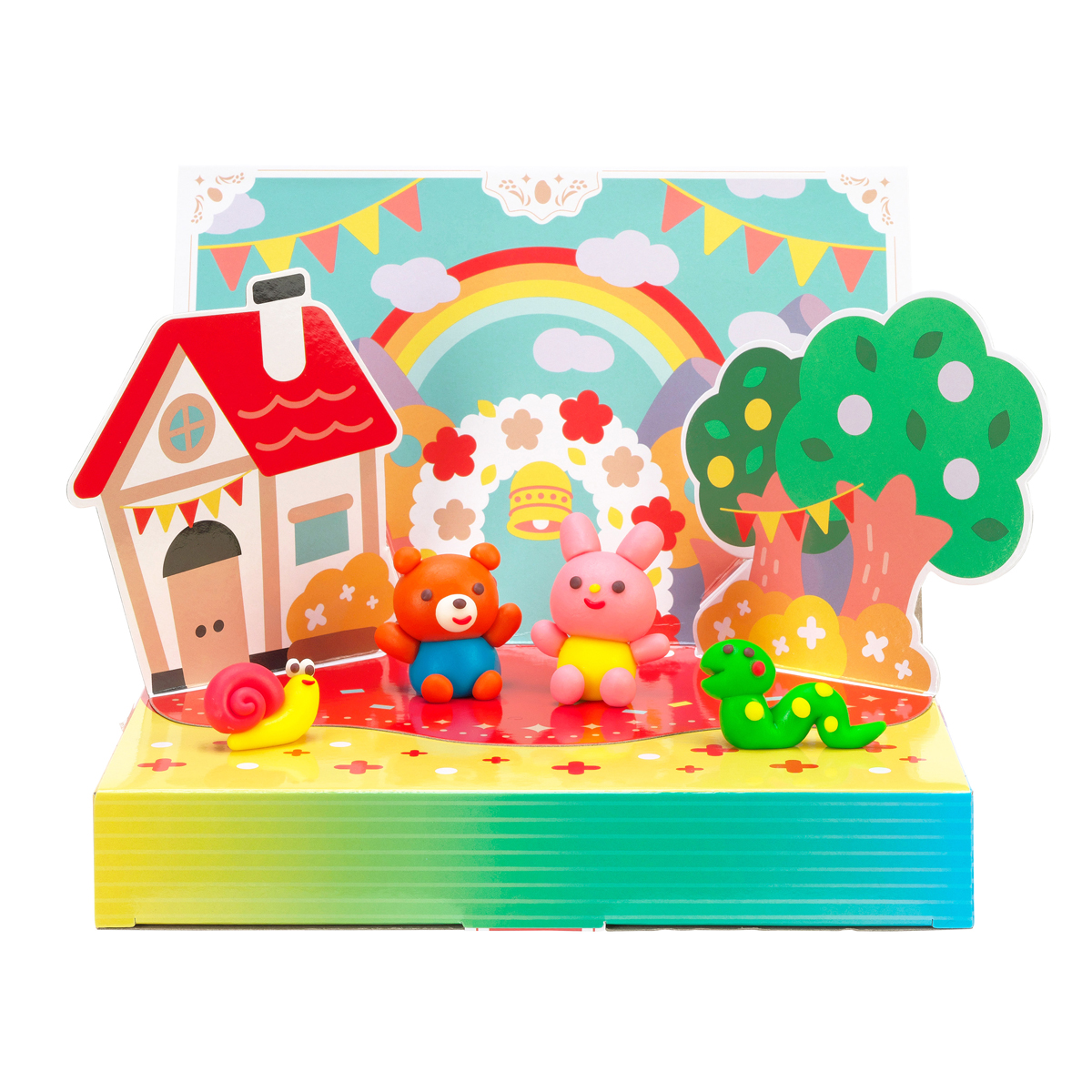 「お米のねんど」30g5色(あか・きいろ・あお・みどり・しろ)、ヘラ、ローラーからなるセットで、「本のかたちをした特製パッケージを開くとカラフルで楽しいポップアップの世界が飛び出す」触れ込み。「まるでステージのように作品を飾れる仕掛けが施されており、お米のねんどでつくった作品を並べて楽しんだり、記念写真を撮って思い出として残したりすることができます」としている。