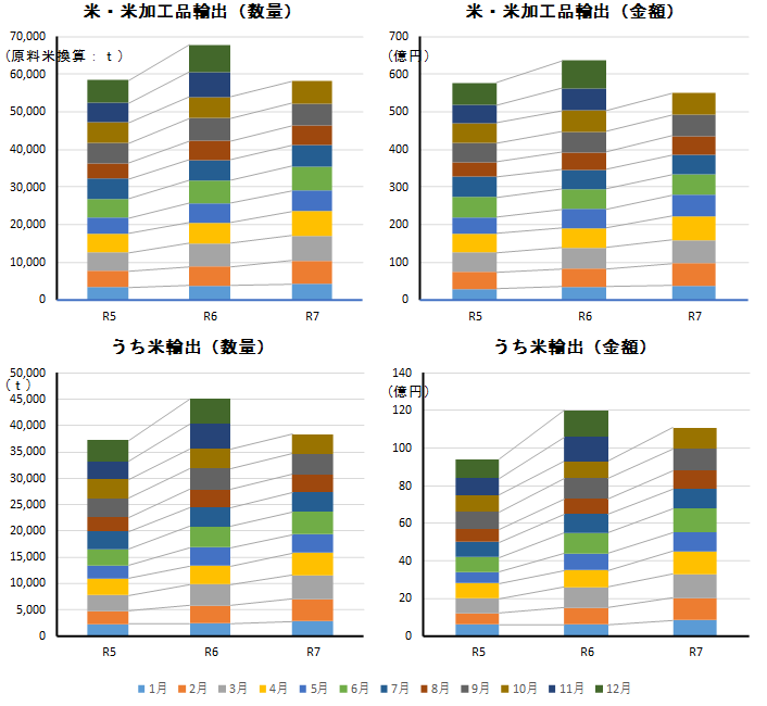 農林水産省は12月16日、米輸出(援助用を除く商業用のみ)を、令和7年(2025)10月の単月で、数量3,718t(前年同期比+1.1%)、金額11億26百万円(+25.1%)だったと発表した。13年連続の過去最高更新に向け、相変わらず好調で、前月より復調した恰好だ。マンスリーレポート12月号のなかで明らかにしたもの。