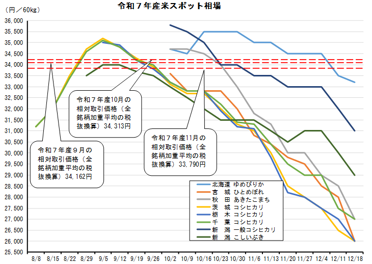 令和7年産米スポット相場が、再び下落を始めた。なかには〝岩盤〟のはずの概算金(一次集荷価格)をすら割り込む銘柄すら出はじめている。一体どのようなカラクリになっているのだろうか。また、いずれ反転上昇するのは誰しも分かっていることだが、その時期と底値の水準に、熱い注目が集まっている。