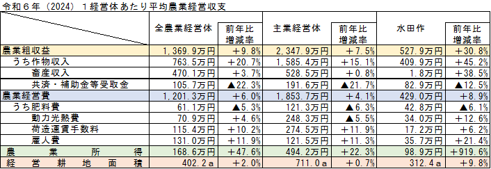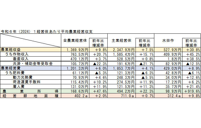 農林水産省は12月19日、令和6年(2024)農業経営体の経営収支を公表した。このうち水田作経営は、増収10倍増益となっている。明らかに「令和の米騒動」に伴う高騰米価が寄与した恰好だ。令和7年産で、さらに上昇している一次集荷価格(概算金)を考えると、「儲け過ぎ」に結果することは必死だ。