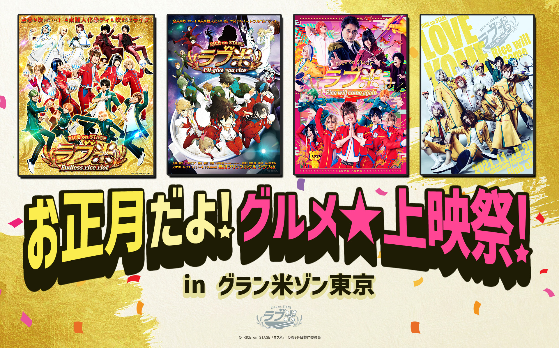 東京都豊島区の映画館、池袋HUMAXシネマズで来年1月17~18日、『RICE on STAGE「ラブ米」お正月だよ!グルメ★上映祭!in グラン米ゾン東京』が開催される。舞台劇シリーズ『RICE on STAGE「ラブ米」』の模様をおさめた映画4作品の上映と併行して、出演者によるトークショーも展開されるイベントだ。で、この舞台劇シリーズの原作が、平成29年(2017)に放送された短編TVアニメ『ラブ米 -WE LOVE RICE-』。どれくらい短編かというと、1話わずか5分。12話×2シーズンにわたって放送されたものの、全部あわせても120分、ちょうど2時間しかない。