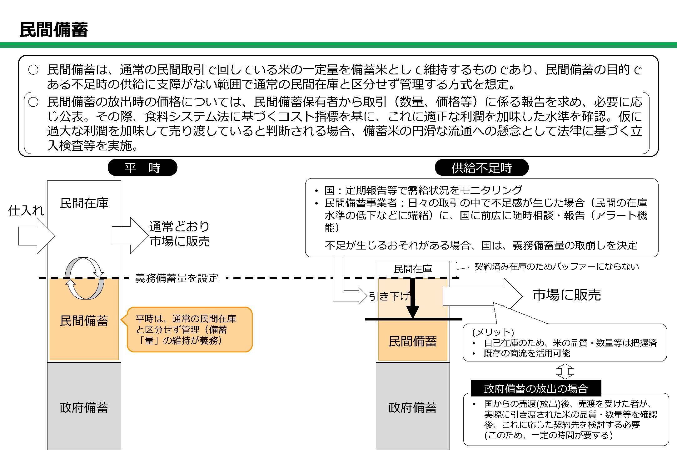 農林水産省の民間備蓄制度案は、「平時は通常の民間在庫と区分せず管理(備蓄〝量〟の維持のみ義務づけ)」⇒「供給不足時、国の指示に基づいて備蓄米を放出」という、かなり大雑把なもの。数量もトリガー(放出基準)も示されていないことから、疑問の声が相次いだ。