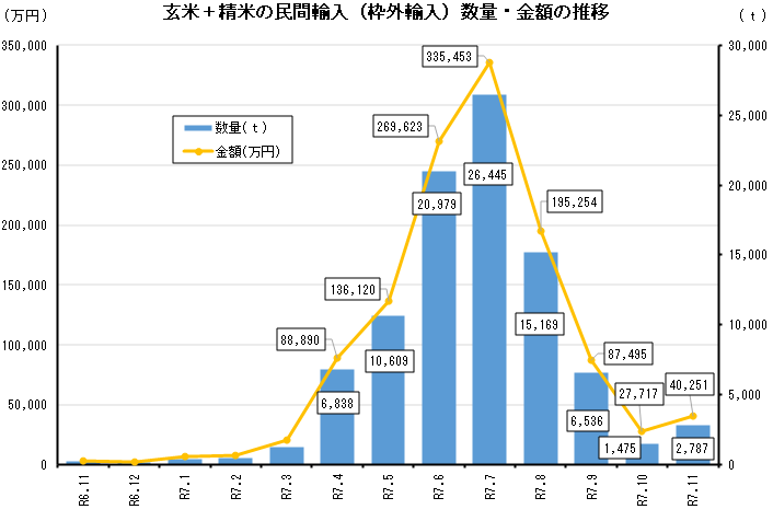 財務省が12月25日に公表した輸入通関実績によると、11月の外国産米輸入量がついに反転増加したものの大した量ではなく、令和7年(2025)累計10万t到達が怪しくなってきたことが明らかになった。11月の外国産米(枠外)輸入量は、2,787t(前月比+88.9%、前年同月比+1279.7%)、4億0,251万5千円(前月比+45.2%、前年同月比+1091.5%)。