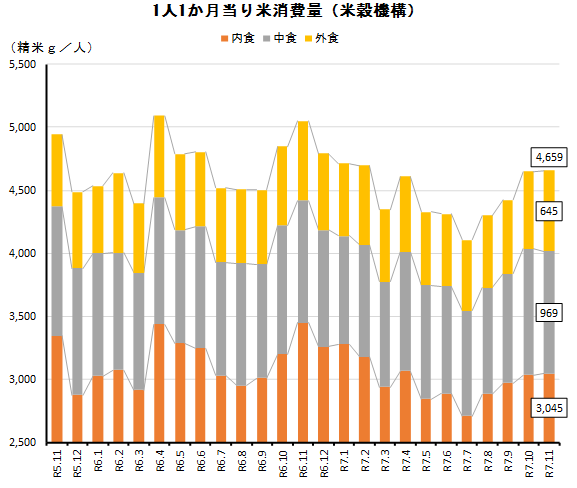 11月の1人1か月あたり米消費量は4,659精米gで、前月比+0.2%と、続伸した。前年同月比では▲7.8%の続落。米穀機構(《公社》米穀安定供給確保支援機構、東京都中央区)が12月25日に公表した「米の消費動向調査結果」によるもの。