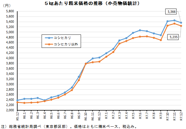 調査統計 小売物価統計総務省 12月の23区5kg店頭米価、3か月ぶり下落 調査統計 X Facebook LINE コピー 2025.12.26 総務省は12月26日、12月の小売物価統計(東京都区部のみ)を発表した。それによると、「コシヒカリ」前月比▲82円の5,366円、「コシヒカリ以外」▲88円の5,235円と、ともに3か月ぶりで下落に転じた。令和7年産米が主体になってからの下落は初めて。前年同月比増減率は、コシ+33.5%、非コシ+35.3%と、相変わらず高値なものの、上げ幅が鈍る傾向が続いている。