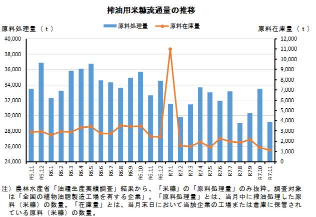 農林水産省は12月26日、11月の油糧生産実績調査結果を公表した。それによると搾油用原料(米糠)処理量、つまり米糠の流通量は2万9,168tとなった。前月比▲12.9%は反落、前年同月比▲10.7%は12か月連続落にあたる。明らかに令和6年産米の出回り後から、流通量が低迷している。令和6年産では生産量が少なかったから、令和7年産に入ってからは売れ行きが芳しくないから、と考えられる。