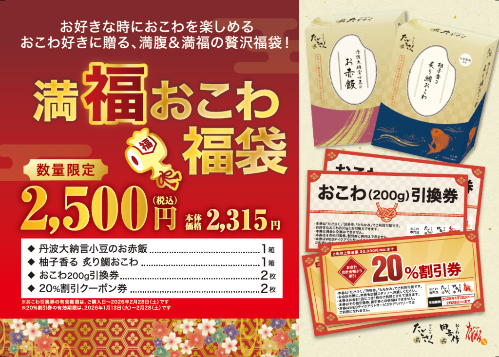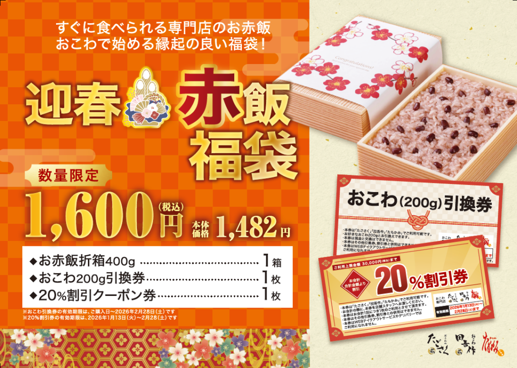 新商品 おこわおこわ福袋たごさくたもかみグリーンハウスフーズ福袋 おこわ専門店で元日から「おこわ福袋」 新商品 X Facebook LINE コピー 2025.12.30 ㈱グリーンハウスフーズ(東京都新宿区)が展開するおこわ専門店「たごさく」「たもかみ」は来年1月1日から、福袋を発売する。1月12日までの期間限定販売。なくなり次第終了。ラインナップは以下の3種(価格は税込)。 満福おこわ福袋 (2,500円)丹波大納言小豆のお赤飯、柚子香る 炙り鯛おこわ、おこわ200g引換券、20%OFFクーポン めで鯛おこわ福袋 (1,500円)柚子香る 炙り鯛おこわ、おこわ200g引換券、20%OFFクーポン 迎春赤飯福袋 (1,600円)お赤飯折箱(400g)、おこわ200g引換券、20%OFFクーポン《1月4日までの期間限定販売》