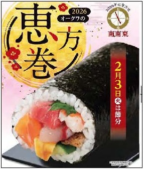 新商品 オークワ恵方巻 オークワの恵方巻、1月29日まで予約受付中 新商品 X Facebook LINE コピー 2026.01.08 中部から関西にかけて153店舗の量販店チェーンを展開する㈱オークワ(和歌山県和歌山市)では、今年の恵方巻の予約を受け付けている。1月29日まで。受取期間は2月1~3日。ラインナップ(一例)は以下の4商品(価格は税別)。 魚屋の ご馳走 海鮮 太巻(2,980円) 幸福 彩りサラダ恵方巻き(880円) 来福 山形県産黒毛和牛の贅沢恵方巻き(1,280円) 味彩恵方巻き(798円)
