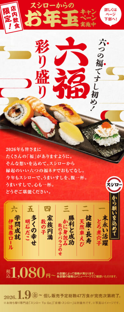 回転寿司チェーン「スシロー」を展開する㈱あきんどスシロー(大阪府吹田市)は1月9日、新春の新商品「六福彩り盛り」を発売した。税込1,080円。販売予定総数47万食が完売次第終了。〝六福〟の内訳は以下の通り。