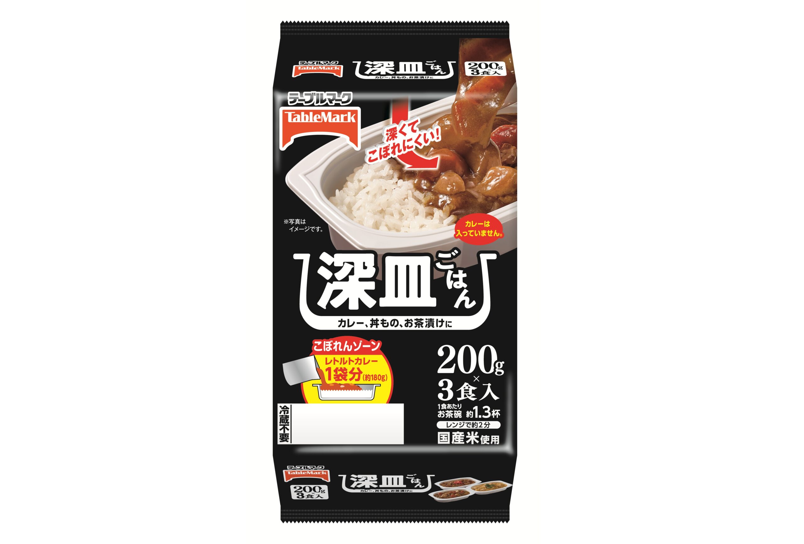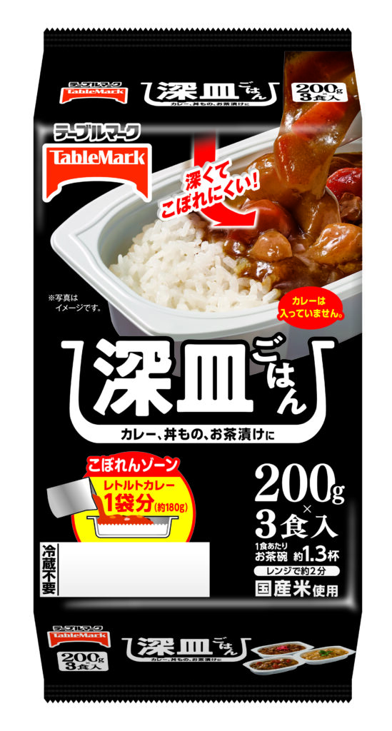 深皿ごはん 3食 地域限定発売。「お皿いらずで、トレーのままカレーなどをかけて食べられる深皿のパックごはん」。「1食200gとしっかりした内容量でありながら、深さに余裕のあるトレー形状により、レトルトカレーや汁気の多い丼ものなどもそのまま盛り付けて食べることができる」。