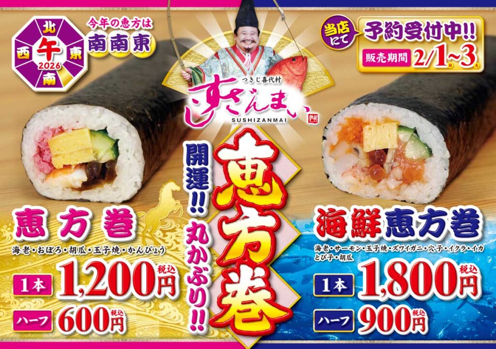 新商品 すしざんまい すしざんまい、2月1~3日「恵方巻」予約受付中 新商品 X Facebook LINE コピー 2026.01.19 ㈱喜代村(東京都中央区)が展開する寿司店「すしざんまい」は2月1~3日、恵方巻2アイテムを販売する。現在、予約受付中。ラインナップは以下の通り。価格はいずれも税込で、昨年より一律200円値上げしている。 \1本ハーフサイズ具材恵方巻1,200円600円海老、おぼろ、きゅうり、玉子焼き、かんぴょう海鮮恵方巻1,800円900円海老、サーモン、玉子焼き、ズワイガニ、穴子、イクラ、イカ、とび子、きゅうり