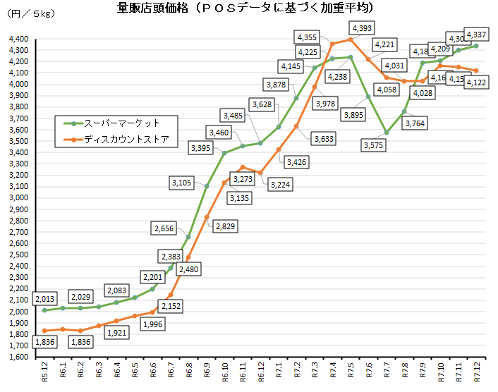 農林水産省は1月20日、うるち精米の量販店頭価格(POSデータ)を、昨年12月の全POS取引平均価格(全体の加重平均)で5㎏4,337円だったと公表した。前月比+37円、前年同月比+852円にあたる。マンスリーレポート1月号のなかで明らかにしたもの。取引数量は3,539t(前月比▲14t)と6か月連続で減少している。価格が高止まりしているのだから買い控えるのは当然だ。一方、ドラッグストアの全POS取引平均価格は5㎏4,122円(前月比▲32円)で、小幅ながら続落。量販店頭価格との差を広げている。
