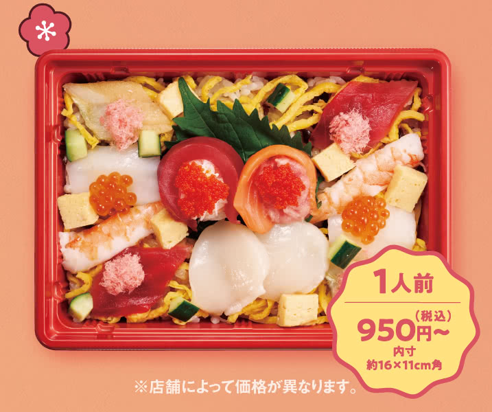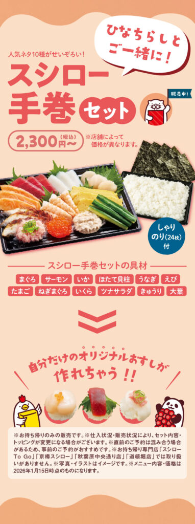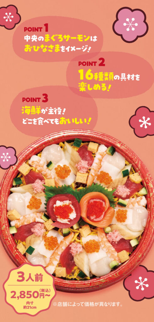 新商品 スシロー スシロー「華やか海鮮ひなちらし」予約の受付開始 新商品 X Facebook LINE コピー 2026.01.22 ㈱あきんどスシロー(大阪府吹田市)が展開する回転寿司チェーン「スシロー」は1月21日、店頭、電話、ネットで、雛祭りに向けた「華やか海鮮ひなちらし」の予約受付を開始した。受取は2月18日~3月3日。1人前(約16×11cm角)税込950円、3人前(約21cm)2,850円のほか、10種のネタとシャリ、海苔24枚がセットになった「スシロー手巻きセット」(2,300円)も。