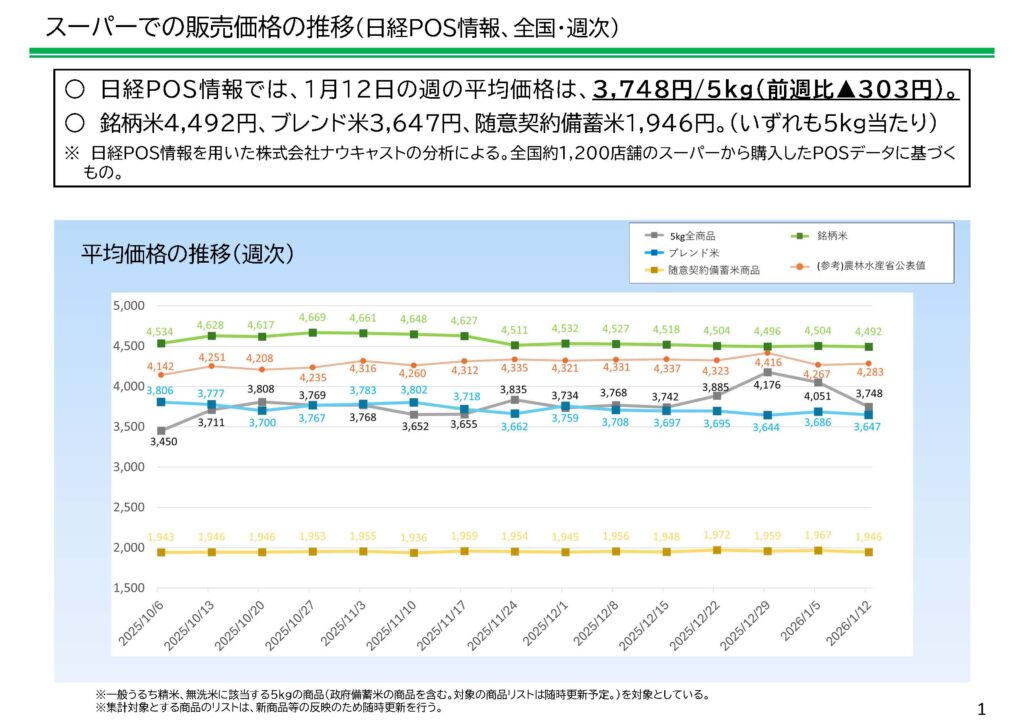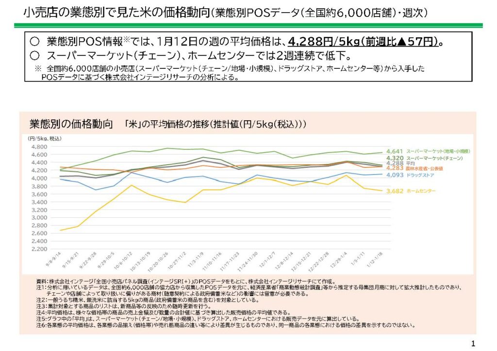 農林水産省は1月23日、米穀末端価格データを更新、公表した。それによると1月12日(月)~1月18日(日)のスーパーなど量販店頭価格(5㎏あたり精米)は、KSP-POS+16円の4,283円と反発したものの、日経POS▲303円の3,748円、小売店パネル▲57円の4,288円と続落、日経POSのみ再び3,000円台に落ちる結果となった。