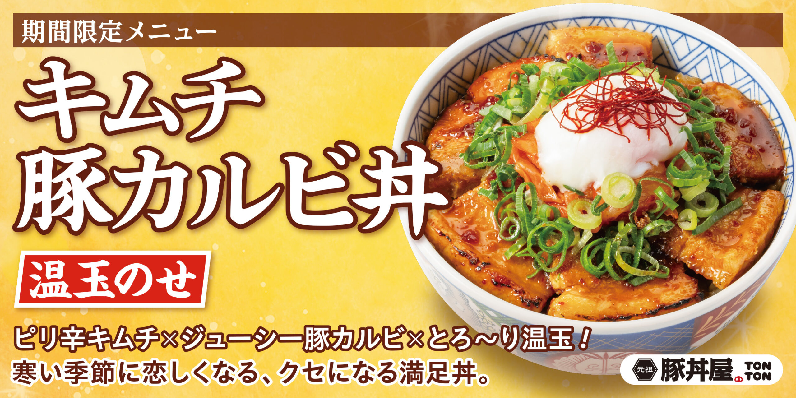 新商品 元祖豚丼屋TONTON 「元祖豚丼屋TONTON」2月限定メニュー「キムチ豚カルビ丼 温玉のせ」 新商品 X Facebook LINE コピー 2026.01.30 複数の専門外食チェーン運営のワンズトライン㈱(大阪府大阪市)が運営する「元祖豚丼屋TONTON」は2月1日から、新メニュー「キムチ豚カルビ丼 温玉のせ」を発売する。2月いっぱいまでの期間限定販売。並盛1,280円(税込)。 キムチ豚カルビ丼 温玉のせ並盛1,280円大盛1,480円特盛1,680円メガ2,180円