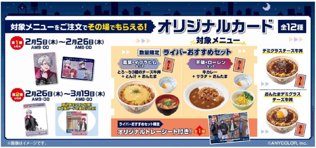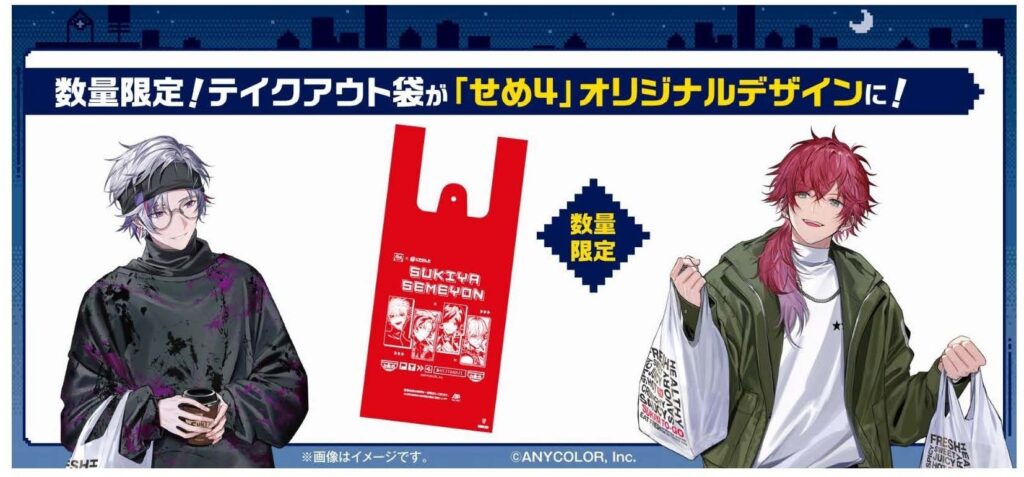 対象メニューの注文でもれなくオリジナルカードがもらえるほか、限定のオリジナルグッズが当たるWEB抽選、コラボ内容を紹介するPR配信、〝せめ4〟メンバー4名によるオリジナル店内放送、2店舗限定の特別装飾、コラボオリジナルデザインのテイクアウト袋、すき家公式Xキャンペーンなど。