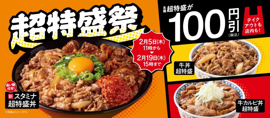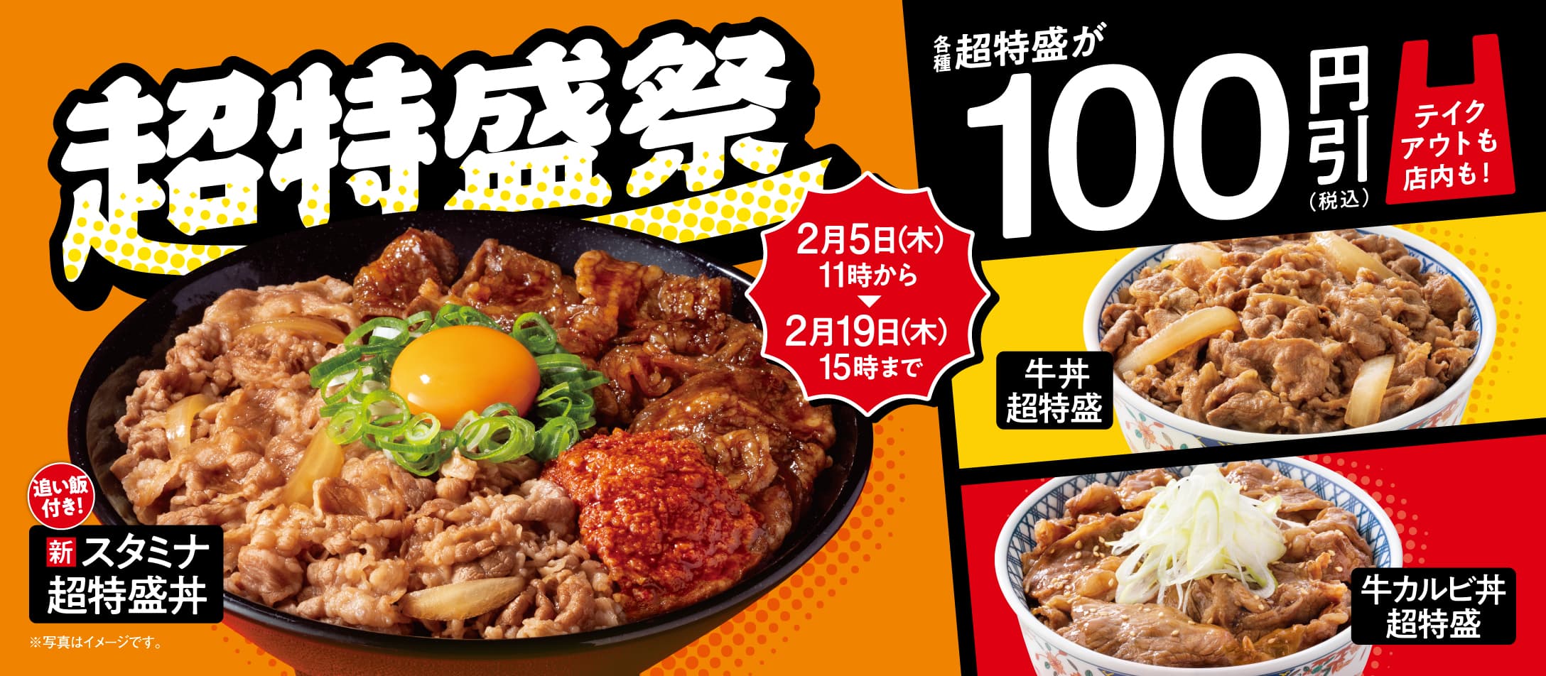 フェア 吉野家 吉野家が超特盛丼100円引き&「スタミナ超特盛丼」再販 フェア X Facebook LINE コピー 2026.02.04 ㈱吉野家(東京都中央区)が運営する牛丼チェーン「吉野家」は2月5日午前11時から、「超特盛祭」を開始する。2月19日午後3時までの期間中、各種超特盛丼を一律税込100円引きで提供する。また「スタミナ超特盛丼」(税込1,271円)の再販も開始しており、キャンペーン期間中は税込1,171円で食べられることになる。